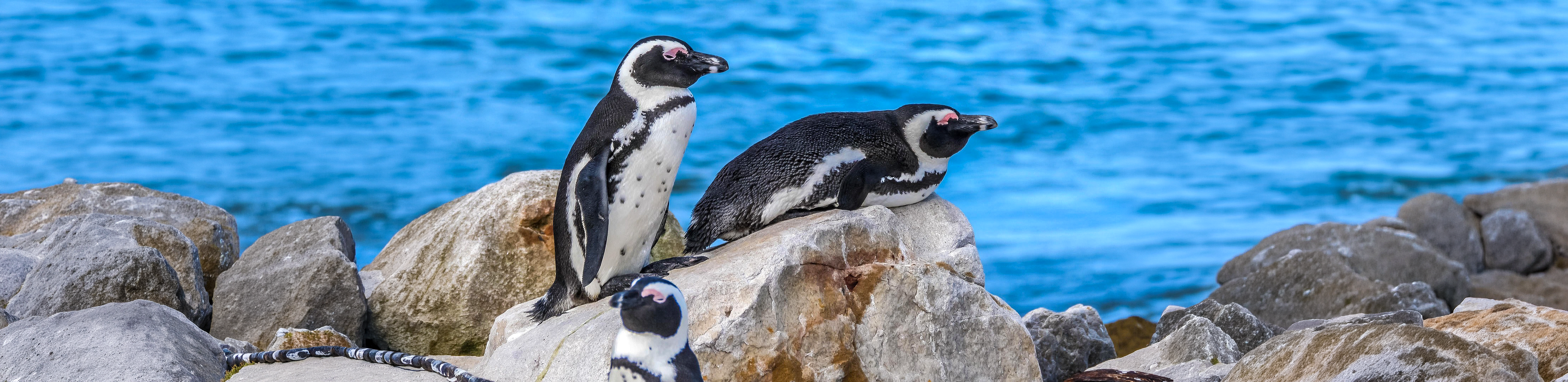 African penguins are medium-sized flightless birds found along the coasts of South Africa and Namibia. They are the only penguin species native to Africa. These distinctive birds have black and white plumage with a characteristic black line running across their chest.