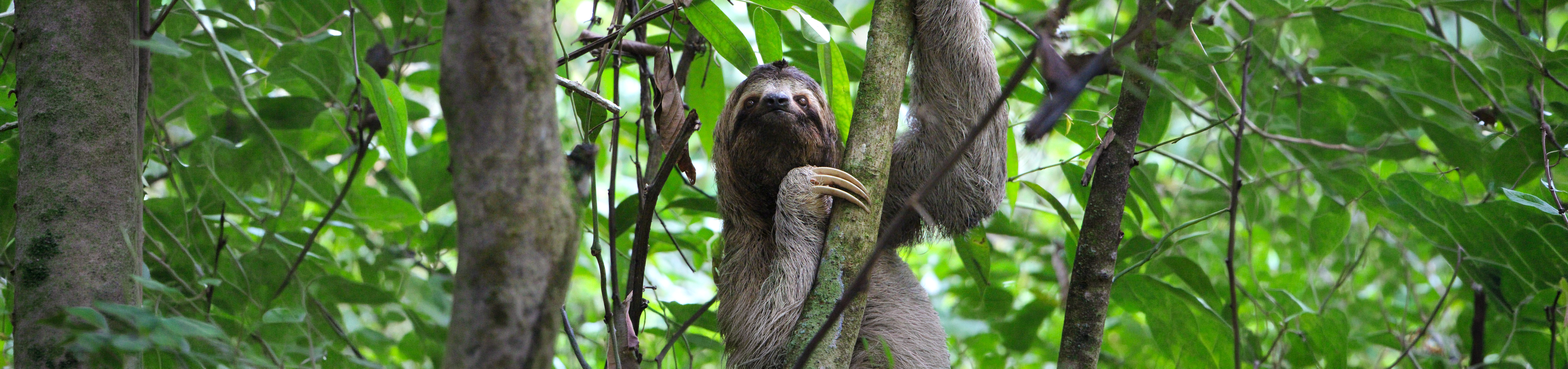 Sloths are tree-dwelling mammals found in the rainforests of Central and South America. They move slowly through the canopy, spending most of their lives hanging upside down from branches.